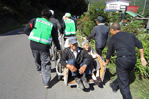本番さながらの避難訓練で、防災委員長の「訓練、大津波警報発令!」の声とともに、役員が手分けして各班に情報の伝達と避難指示を行いました。各棟の班長の点呼の後、幼児からお年寄りまで参加者53人が徒歩または歩行困難者用救急リヤカー2台に分乗し、自治会が指定した500m先の高台にある避難場所を目指しました。