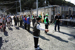 10月14日、関谷担い手仮設住宅で防災避難訓練が行われました。ここは、80世帯と山田町の中でも規模が大きい仮設住宅団地です。