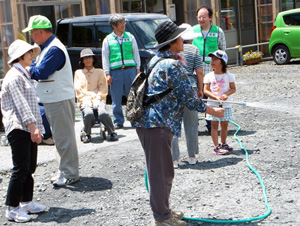 取扱い説明会は、7月31日に山田町、8月1日に大槌町の各3か所で行われ、設置される仮設住宅団地の代表の方が集まりました。東北とはいえ、厳しい炎天下での説明会。参加者全員、日陰に隠れても滝のような汗をかきながら、操作の説明を真剣に聞かれていました。演習では、参加者全員が順番に放水を体験し、女性でも簡単に扱えることを感得しました。