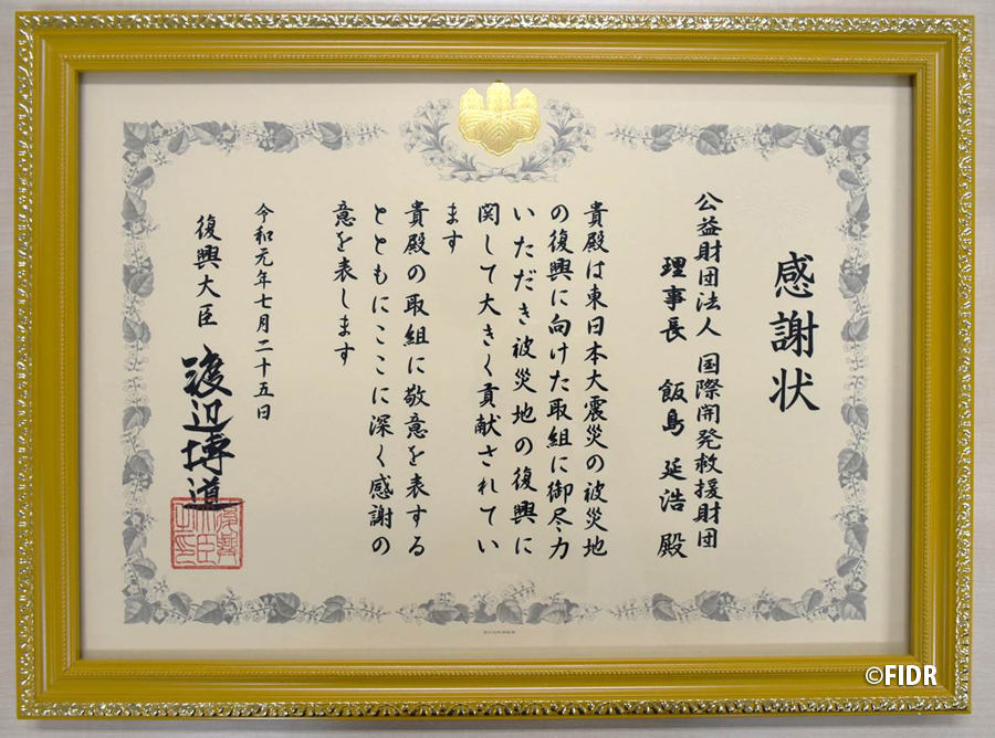 このたび、東日本大震災の被災地の復興に向けたFIDRの取り組みと貢献が評価され、渡辺博道復興大臣より感謝状が贈呈されました。