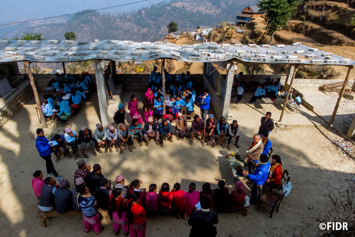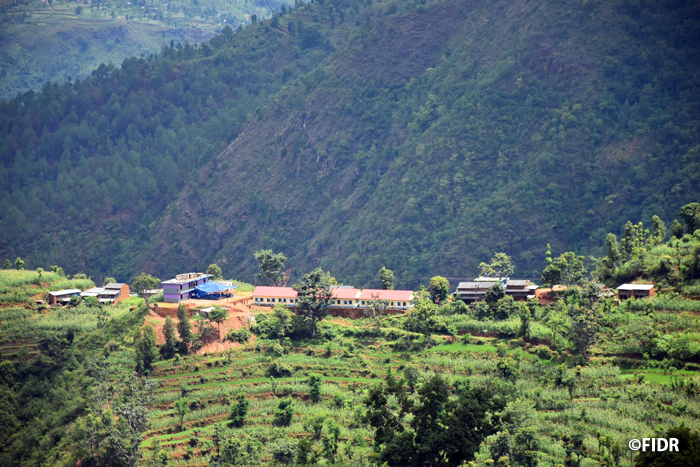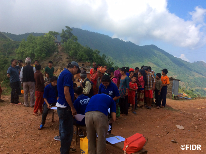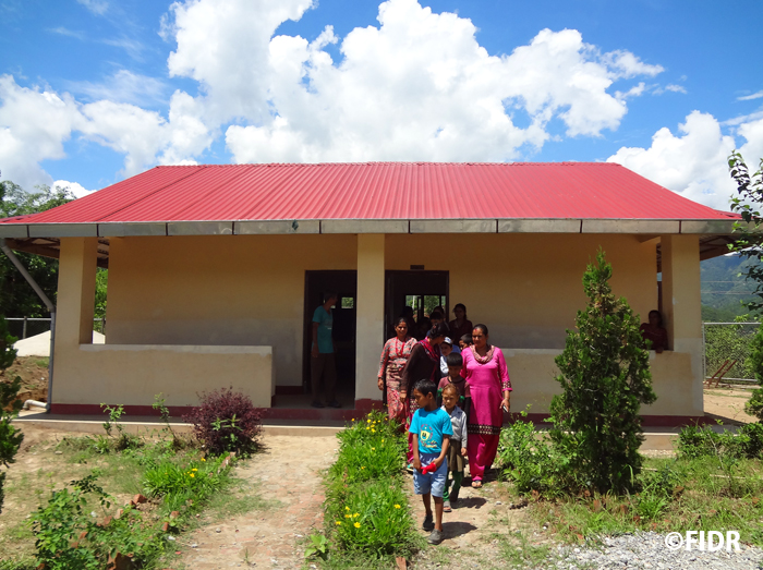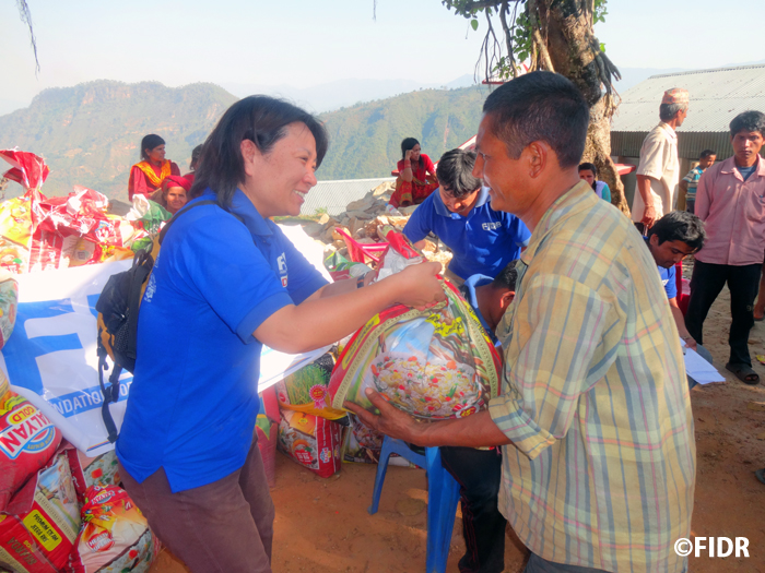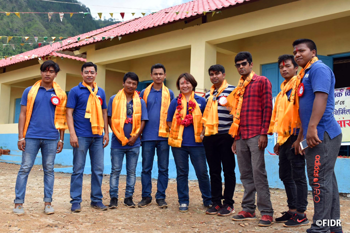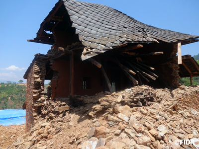 FIDRは2015年のネパール大地震後、被害が大きかったダーディン郡の住民に対し食糧や防水シート、衛生用品を配布するなど緊急援助活動を行いました。また、多くの学校が倒壊し子どもたちが授業を受けることができない状況だったため、応急的な仮設教室を建設し、その後、同郡で5校の学校校舎を再建しました。