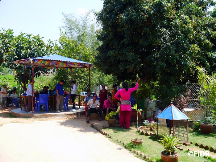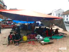 大震災から18日目の5月12日、ネパールは再び強い余震に襲われました。そのとき、FIDRチームはカトマンズから車で4時間かけ、ダーディン郡の郡都ダーディンベシに到着し、昼食を取り終えたところでした。揺れに気付き、すぐにレストランの裏庭に避難。余震におびえる日々を送っているネパール人女性たちの中にはパニックに近い状況になり、座り込んでしまう人も見受けられました。