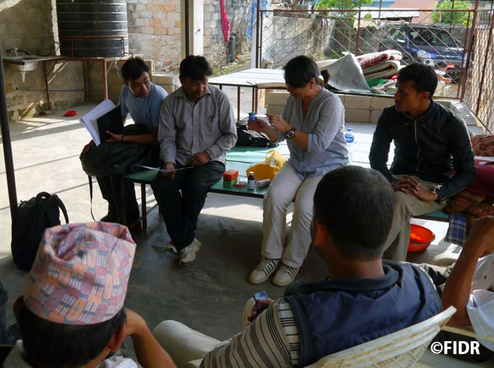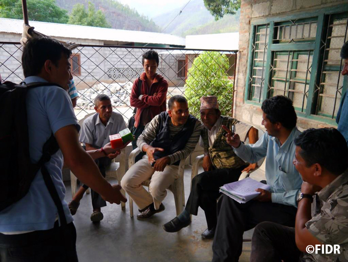 FIDRネパール事務所は日本人の所長と現地スタッフ2名で活動しています。地震当日、スタッフたちは2011年から支援活動を行っているダーディン郡内の小学校で行われていたセレモニーに参加している最中でした。幸いにも参加していた子どもやスタッフたちには怪我はなく、スタッフたちは地震直後からカトマンズに移り現地での情報収集にあたっていました。