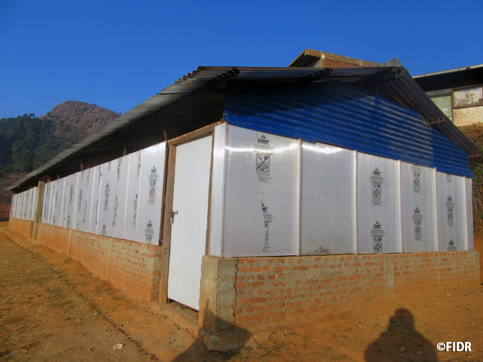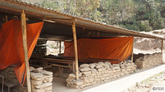 FIDRは震災後、地域総合開発事業の支援対象地であるダーディン郡において、食糧(米)、防水シート、衛生用品の配布、仮設教室の建設による緊急援助活動を実施し、その後、ネパール復興庁より国際協力NGOの中でいち早く建設許可を得、同郡3地区で5校の学校校舎建設を実施、今年6月までに校舎再建を完了しました。