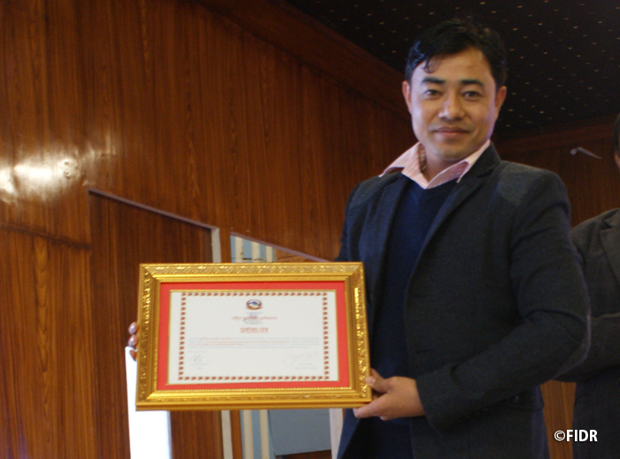 昨年12月にFIDRは、ネパール政府復興庁(※)より、震災復興支援への貢献に対する感謝状を授与されました。