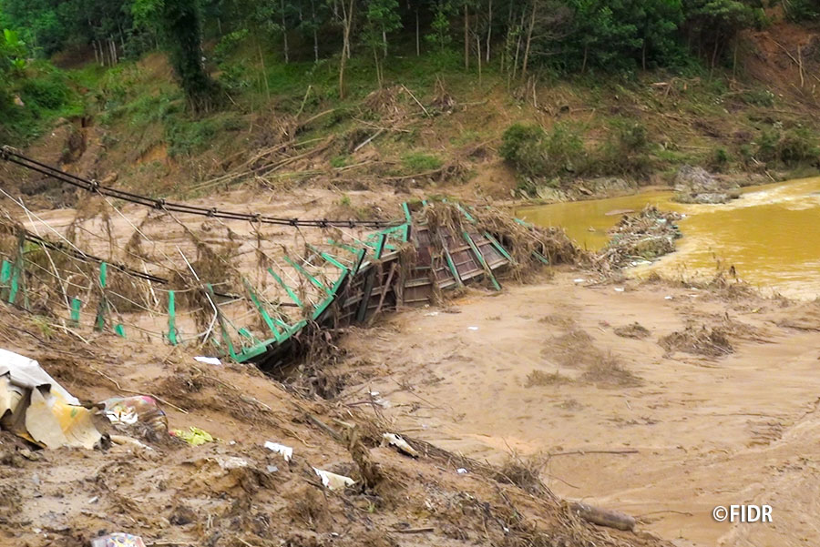 タイヤン郡は、高地部を中心に土砂崩れの爪痕が残ったままで、物資を配布する村々への道も寸断されている状態でした。FIDRは、家屋が浸水・倒壊した71世帯に毛布、ハンモック、米・干物等を、家屋が損傷したり家財を失ったりした287世帯には、防虫網、石鹸、ミルク等を手渡しました。また、今後の災害に備えて、スコップ、ロープ、ライト等のレスキュー・キット90セットをタイヤン郡の行政機関を通じて、郡内の村々に配布しました。
