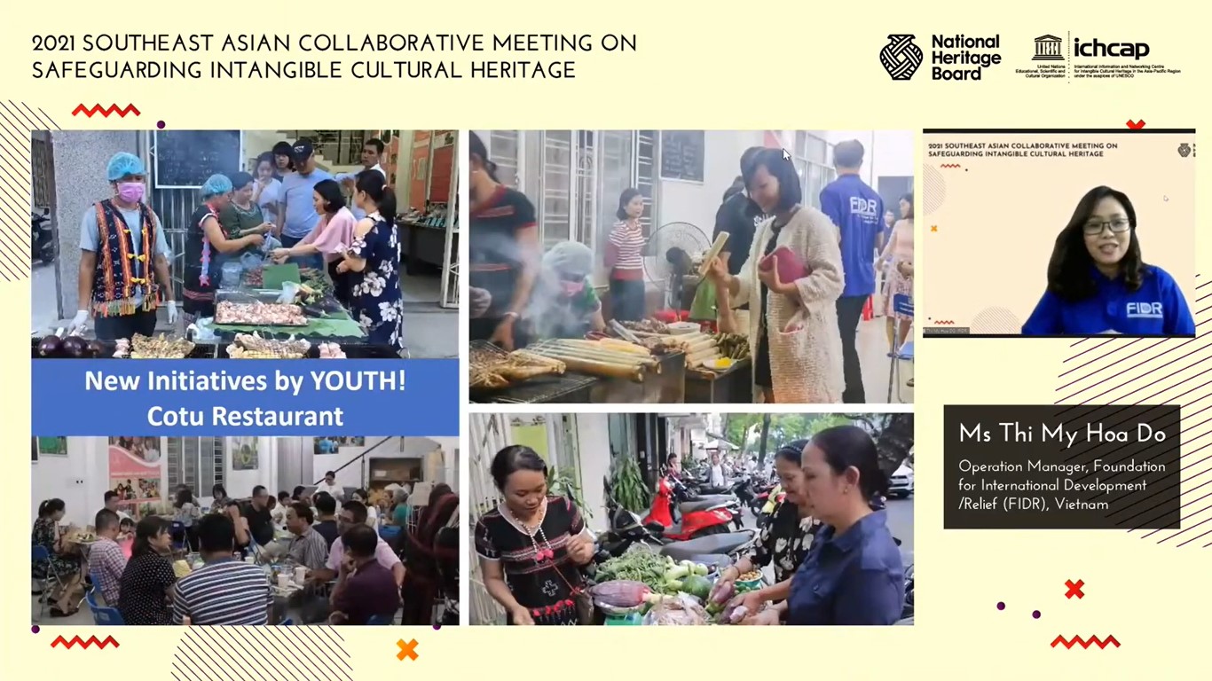 UNESCO 無形文化遺産国際情報ネットワークセンター(ICHCAP)及びシンガポールの国家遺産局(National Heritage Board)が共催する「伝統文化の保護と継承」の国際会議が8月30日から31日にかけてオンラインで開催され、ベトナム代表としてFIDRベトナム事務所のホア職員が登壇しました。同会議は、アジアを中心とした各国の代表が、無形文化遺産を次世代に継承していくために若者が果たす役割について、自らが携わる事例を共有しました。