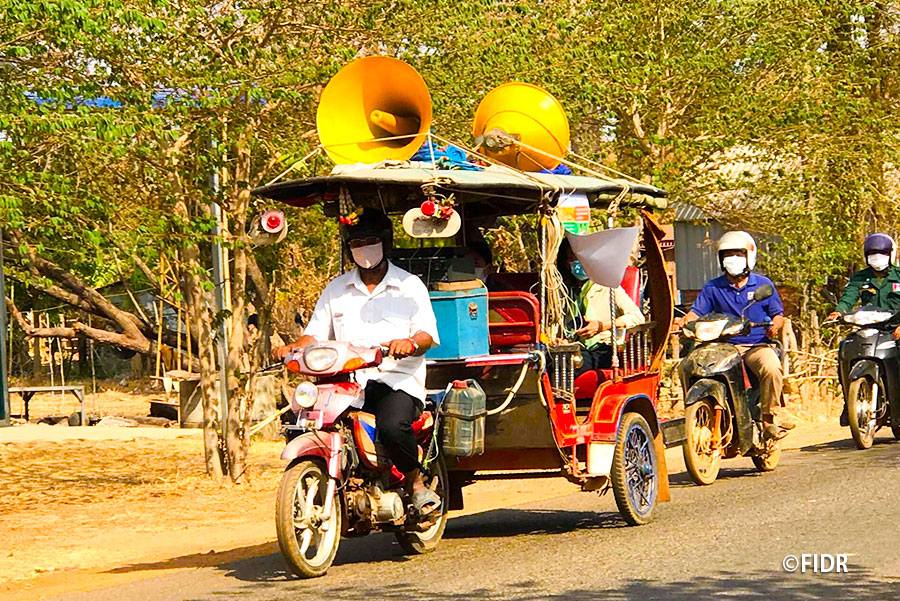 Therefore, FIDR decided to conduct the "COVID-19 prevention campaign" to broadly spread accurate information on COVID-19 and encouraged villagers to take preventive measures. On that day, our staffs drove around the villages together with Commune Councilors, Village chiefs, and the police by tuk-tuks, tractors, and motorbikes. The Commune Councilors strongly conveyed the message to the villagers not to be afraid of COVID-19, but to actively prevent it. This attempt raised the awareness of the villagers about the importance of prevention and it became customary to take preventive measures such as hand-washing.