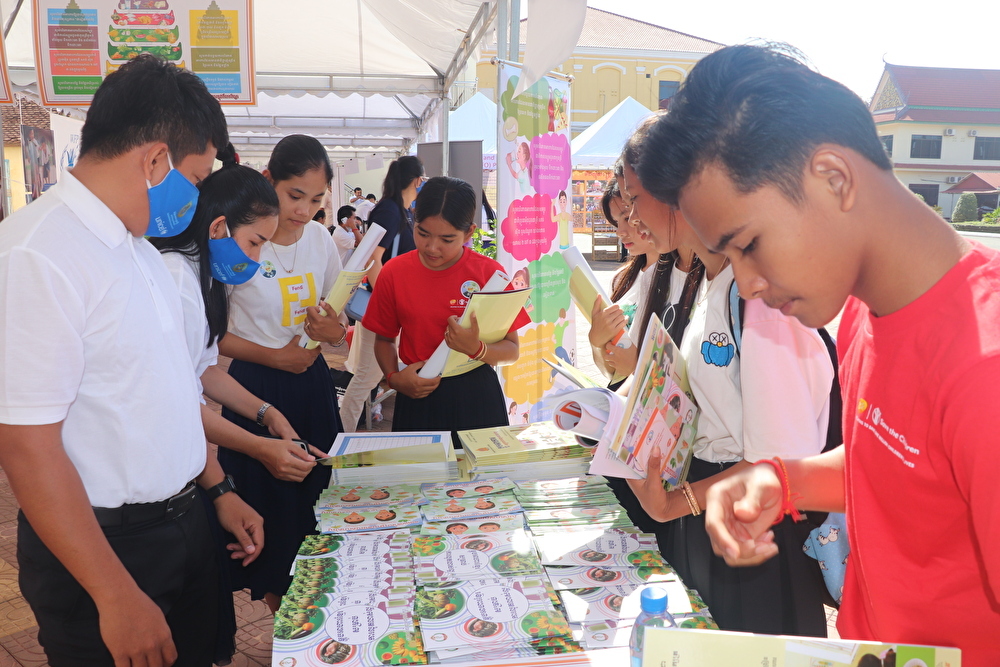600 people including the Deputy Prime Minister, officers from center government and provincial government, members of the Scaling Up Nutrition Civil Society Alliance in Cambodia (SUN-CSA), NGOs, and students, etc participated in the event. At the venue, there were exhibition booths of international organizations, NGOs and private companies which are engaging in nutrition-related activities in Cambodia. FIDR also had one booth and staff of Nutrition Education and Promotion Project introduced the Food-Based Dietary Guidelines (FBDG) to participants by distributing FBDG materials.