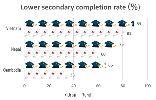 Source: UNESCO (2016)There is a big gap between urban and rural areas in developing countries. Children who could attend secondary and high schools tend to be at urban area, while not a few children in rural area start working without completing primary school education.