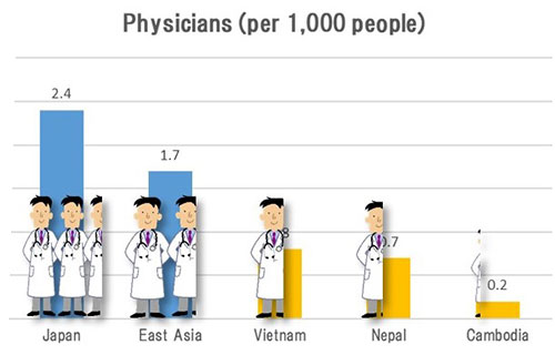 Cambodia is one of the countries in Southeast Asia with the highest child mortality rate. Due to the civil war lasting more than 20 years,, notably the oppressive Pol Pot regime between 1975 and 1979, has caused damage to the medical facilities and medical workers in the country. Since 1980, with support from foreign countries, the training of doctors and nurses and the restoration of medical facilities has gradually progressed, but support still falls short for highly specialized pediatric surgery.