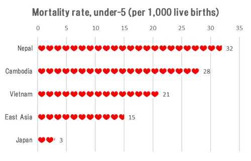 Top quality health and medical care, essential in maintaining quality of life, are especially important in tackling the poverty problem., The third of the seventeen “Sustainable Development Goals” (SDGs), which the international community has set to work together in order to eliminate poverty, goes as “ensure healthy lives and promote wellbeing for all people at all ages”. Globally, the mortality rate of children under five years old, has improved significantly from estimated rate of 93 deaths per 1,000 live births in 1990 to 39 deaths per 1,000 live births in 2018. However, every day in developing countries, many children's lives are lost due to sicknesses, which can certainly be treated in developed countries. The number is over 14 times higher than that in developed countries. There is also a large gap in the mortality rate of children under five years old between developing and developed countries.